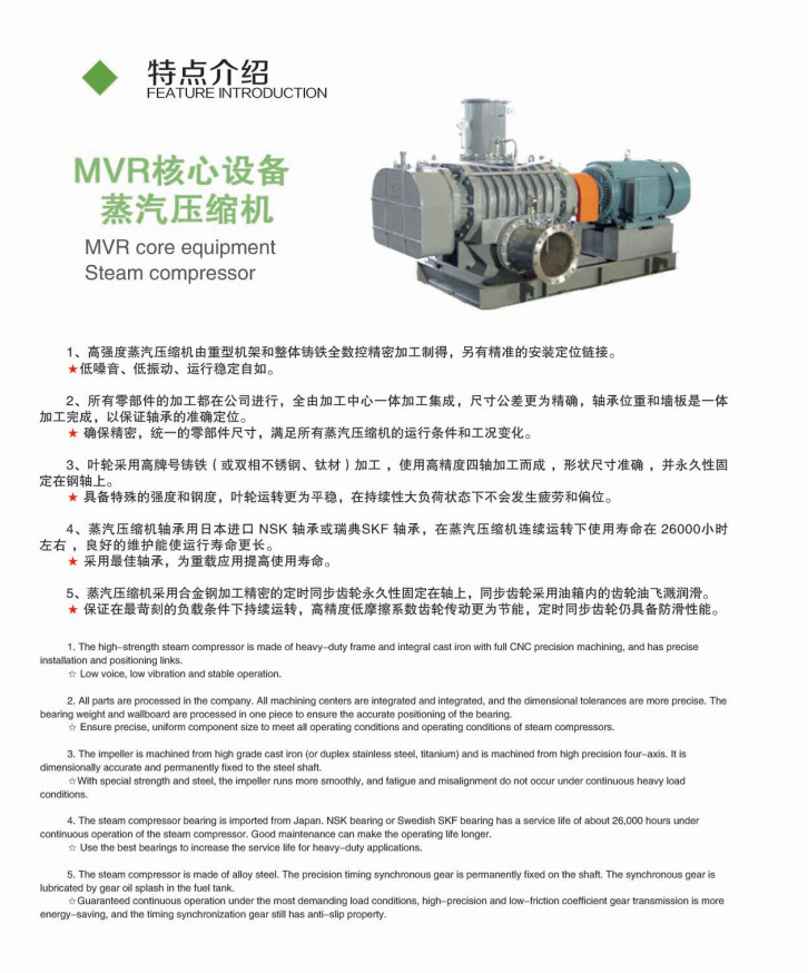 1、高強度蒸汽壓縮機有重型機架和整體鑄鐵全數控精密加工制得,另有精準的安裝定位鏈接。